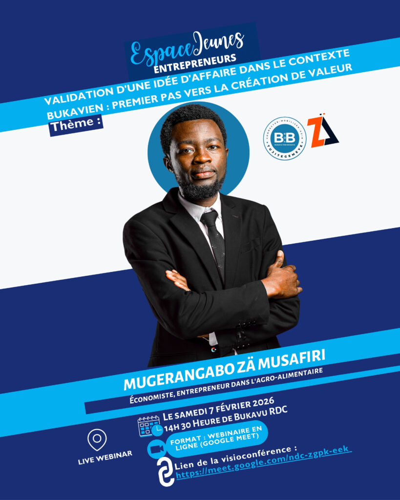 Dans le cadre de son programme Espace Jeunes Entrepreneurs, Bukavu for Bukavu Jeunes organise un webinaire de formation et d’échanges destiné aux jeunes porteurs d’idées d’affaires, entrepreneurs émergents et étudiants intéressés par la création de valeur locale. Cette activité vise à outiller les jeunes de Bukavu afin de mieux comprendre les étapes essentielles de la […]